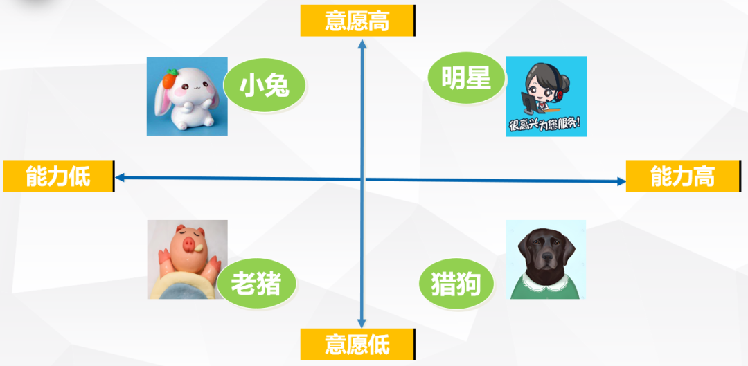 说到小兔你会想到什么?软软弱弱又可爱,就像新员工一样。是的,大部分此象限的是新进员工,尤其6-12个月的新员工,熟悉业务与操作了,意愿非常强烈,但是服务经历尚浅,总有一些让人哭笑不得的错误发生。所以这类员工的管理,在辅助环节可以参考这一篇中的方法:客服新员工留存难?从这三方面对照改善试试。