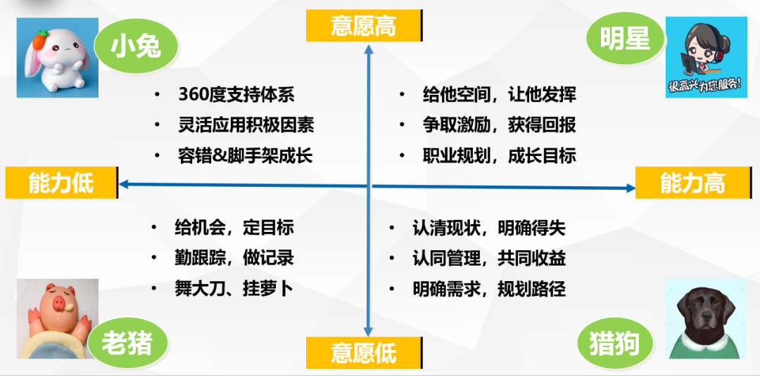 这个法则很简单,用横竖两个轴、四象限表示不同的意愿与能力组合,你可以盘点自己队伍里的人员情况,将其进行划分、归类到具体的象限。为了便于理解,我给每个象限设定了一个特色代号,分别是: