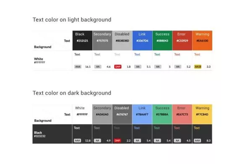 经验证,发现 Google 在明暗两种背景下的配色,几乎都满足 WCAG 2.1 AAA 标准(color contrast ratio > 4.5),唯独白背景下的 warning 色对比度为3.3,仅满足 AA 标准 ( color contrast ratio > 3)。另,disabled 的颜色对比度不属于限定范围,Google 对比度是1.8、2.2。