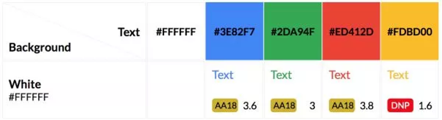 而即使是 brand color,Google 也尽量使之和白背景的对比度满足 AA 标准(黄色、橙色例外)。