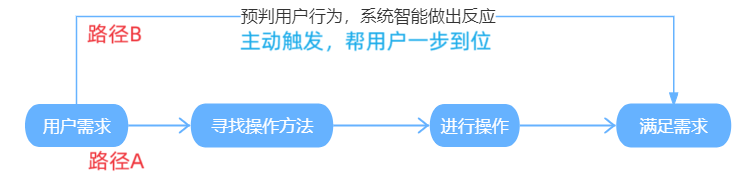 用户产生意图,若让用户自己去摸索方法、进行操作、实现目标,会落于下乘(路径A)。最好预判用户行为,系统智能做出反应,帮用户一步到位(路径B)。