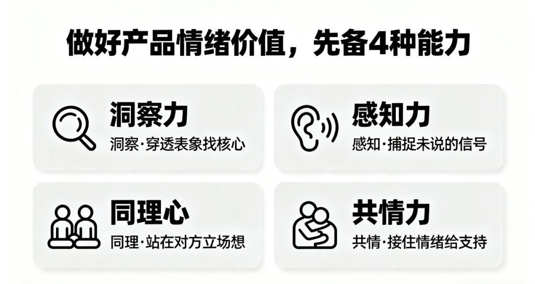 但情绪价值从不是凭空设计的,它需要有人能精准捕捉用户没说出口的需求、读懂他们的情绪波动,再把这些感知转化成产品里的按钮位置、提示文案、反馈节奏;而要做好这件事,就离不开四种核心体验能力:洞察力、感知力、同理心和共情力。