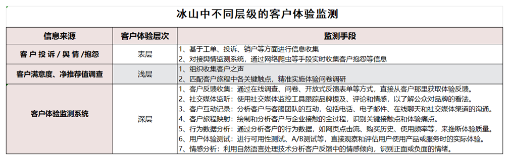 以“冰山理论”为指导,分析挖掘“冰山”各层级的客户体验监测手段(见下表),金融机构不仅能够识别和满足客户的显性需求(冰山的可见部分),还能够深入探索并预测客户的隐性需求和潜在问题(冰山的不可见部分),从而提供更加精准和个性化的服务,增强客户满意度和忠诚度。