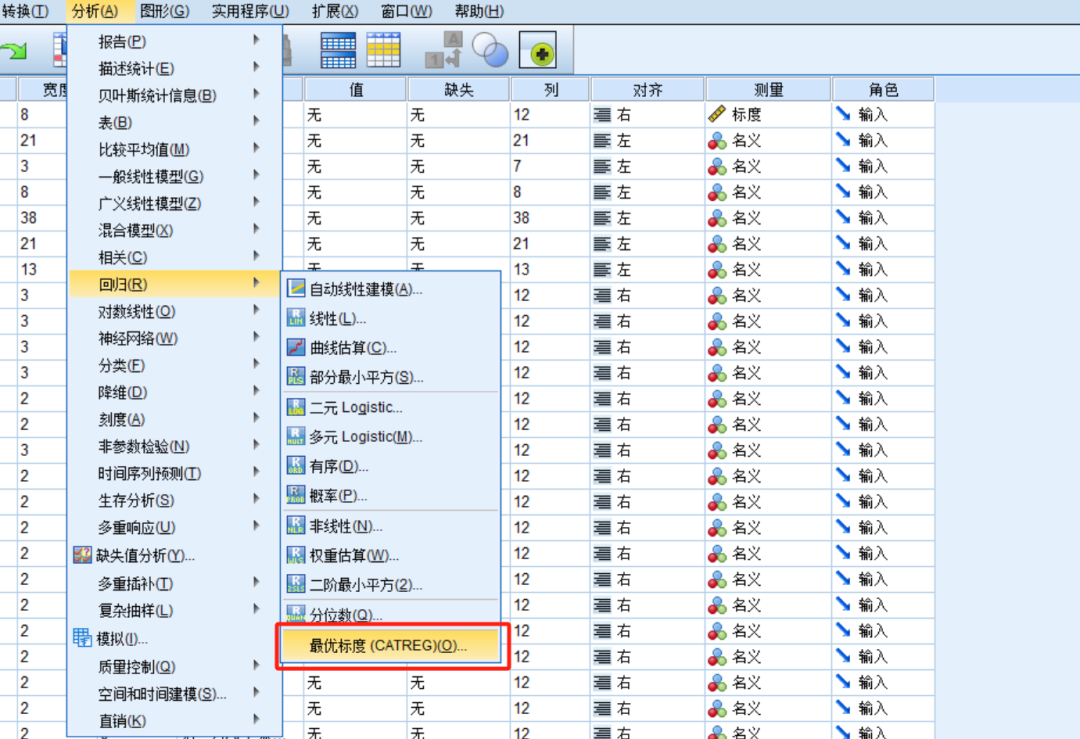 打开分析界面:选择 Analyze > Regression > Optimal Scaling。