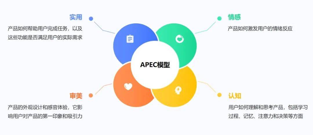 APEC模型即审美、实用、情感和认知模型,由Dhaval Vyas和van der Veer提出。这个从四个关键维度提供了一个全面的视角来理解用户与产品或服务的互动。APEC模型认为,用户体验是一个多维度的构造,不仅包括功能上的满足,还包括情感、审美和认知上的满足,这些因素共同构成了用户的整体体验。