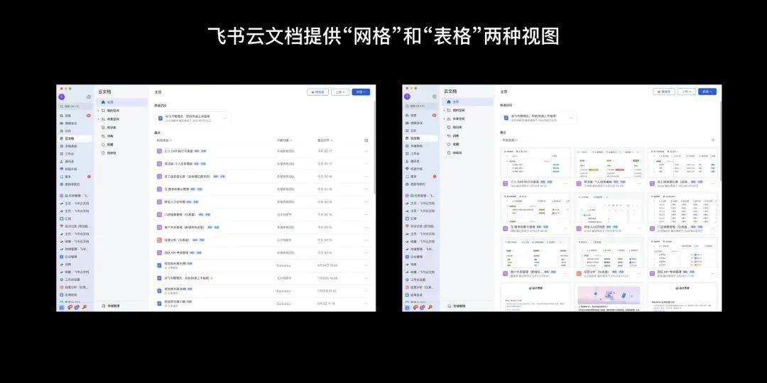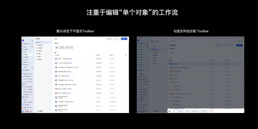 Staff 注重于编辑单个对象的工作流。设计强调直观的工具访问和高效的编辑流程,以便用户可以快速地对资产进行修改和更新。例如,「飞书云文档」列表在默认情况下不显示移动、删除、复制这些管理动作,只有在用户选择了一个特定的对象后,系统才会显示出相关的管理操作栏。