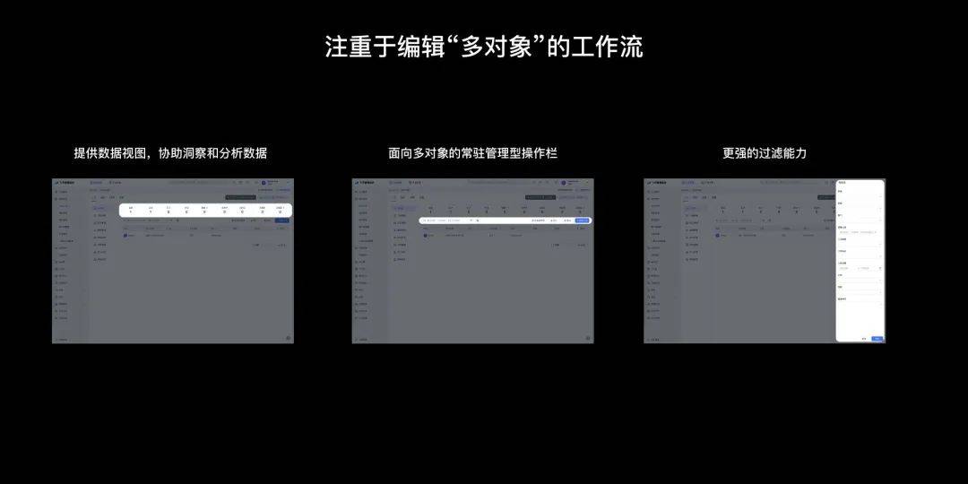 Admin 注重于编辑多对象的工作流:更加重视业务视角的数据统计和快速过滤功能。这类设计允许管理员从宏观的角度监控和管理数字资产,类似于「飞书管理后台-成员部门」页面提供了全面的数据视图,帮助管理员洞察和分析数据。默认展示面向多对象的管理型操作,并提供更强的过滤能力,支持全字段维度的筛选,使管理员能够轻松地管理大量资产。