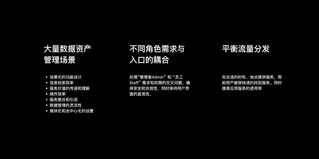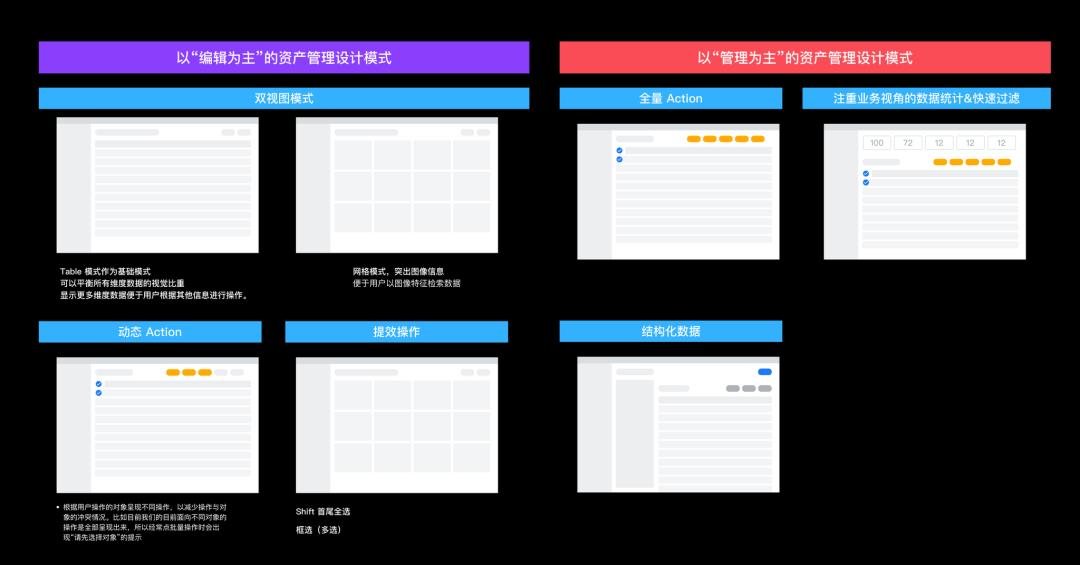 在对我们现有的企业工作台页面进行盘点后,我们发现数字资产管理场景(列表类型)占比高达59%,数量远超其他类型的场景。这一发现突显了数字资产管理在企业工作台中的重要性。然而,这些数字资产管理类场景普遍存在下面这些问题,我们在长期的调研和实践下来总结了”基于数字资产管理服务的阶段设计“、”面向Staff和Admin角色设计”两种视角的设计模式