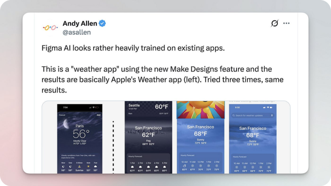 这又让我想起 Figma。去年夏天,当人们为“Make Design”这个新 AI 功能兴奋时,X 上的这篇帖子导致 Figma 下架了该功能,修正问题后,才以“First Draft”的名字重新推出。