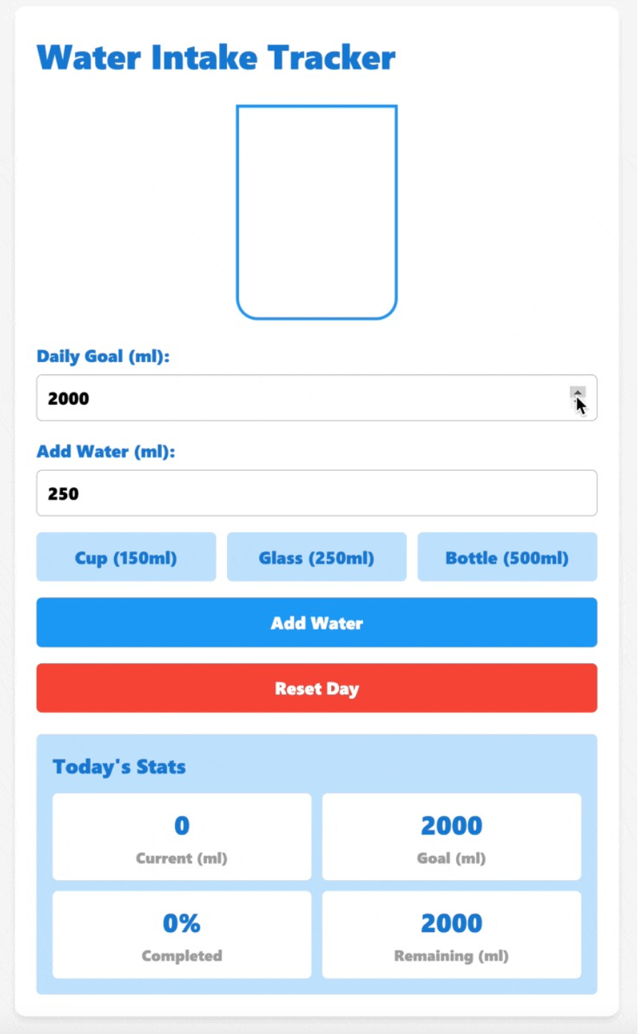 该应用应:- 使用 HTML、CSS 和 JavaScript 构建- 包含输入饮水量的表单、随目标达成而填充的可视化追踪器以及每日统计数据- 拥有简洁直观的界面和响应式设计
